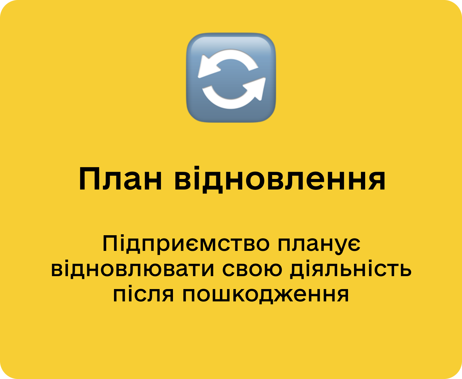 План з відновлення підприємства подається у довільній формі та включає короткий опис пошкоджень, обраний сценарій відновлення (ремонт, релокація, або частковий запуск підприємства).
