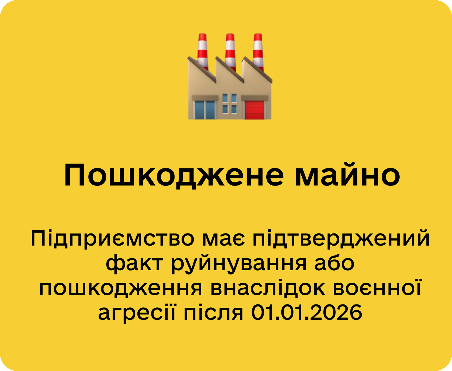 отримати допомогу можуть підприємства, які зазнали пошкодження або знищення майна через бойові дії, теракти чи диверсії, які сталися після 01.01. 2026 р.